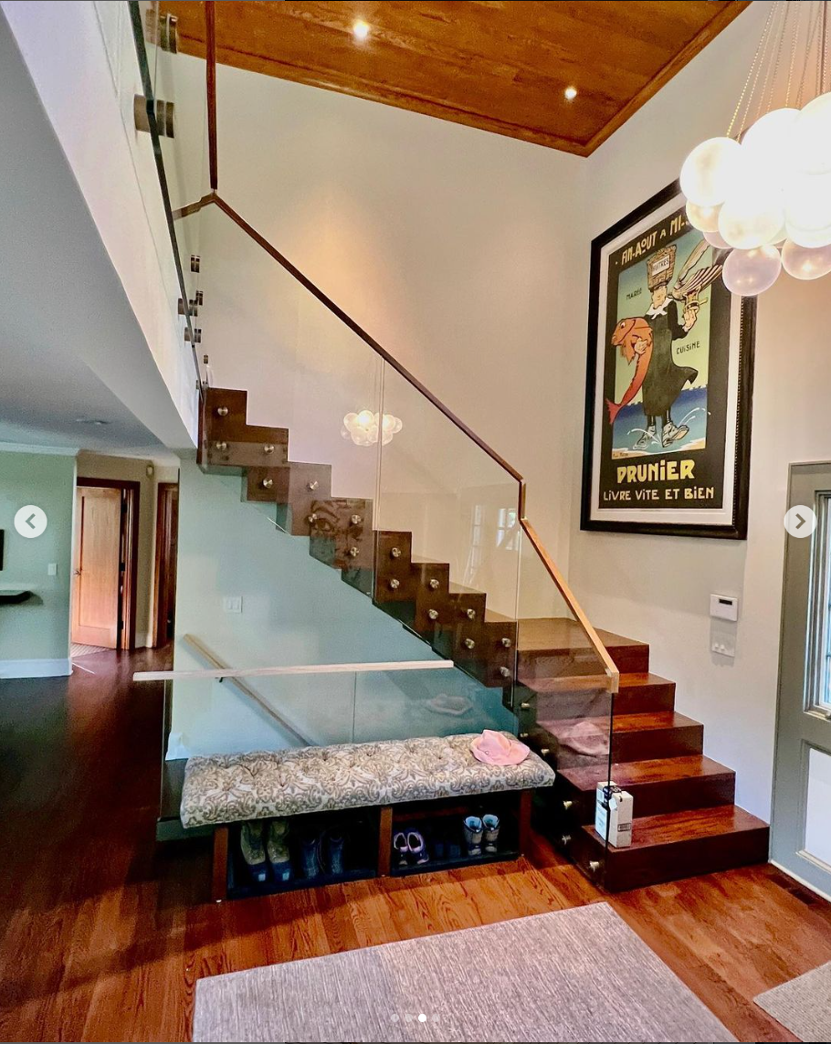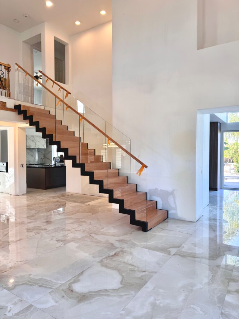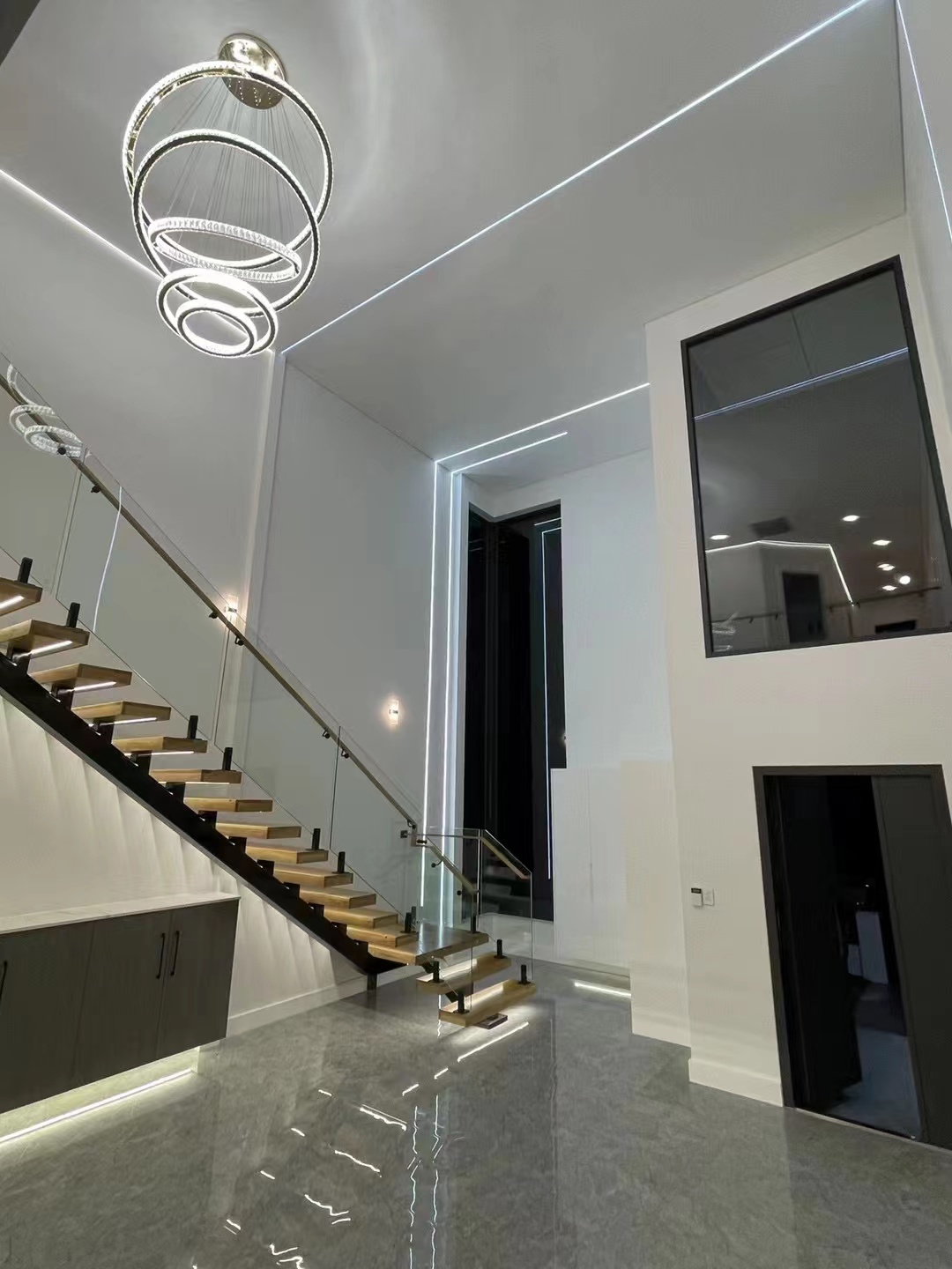L shape indoor white oak straight staircase with led light and spigot glass railing